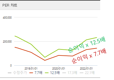 당연하게도 순이익에서 12.5배를 곱한 선을 나타냈기에 아까 표시한 7.7배 선보다는 위쪽에 있고, 형태도 유사하다.