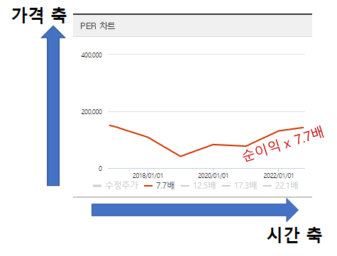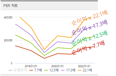 즉, 시기별로 주가가 순이익의 몇 배정도에서 거래가 되는지를 나타낸 선이다.