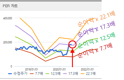 당연하게도 순이익에서 12.5배를 곱한 선을 나타냈기에 아까 표시한 7.7배 선보다는 위쪽에 있고, 형태도 유사하다.