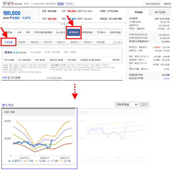 그리고 종목분석-기업현황에서 아래로 스크롤을 내리면 밴드 차트 두 개 중에서 PER 차트가 보인다.